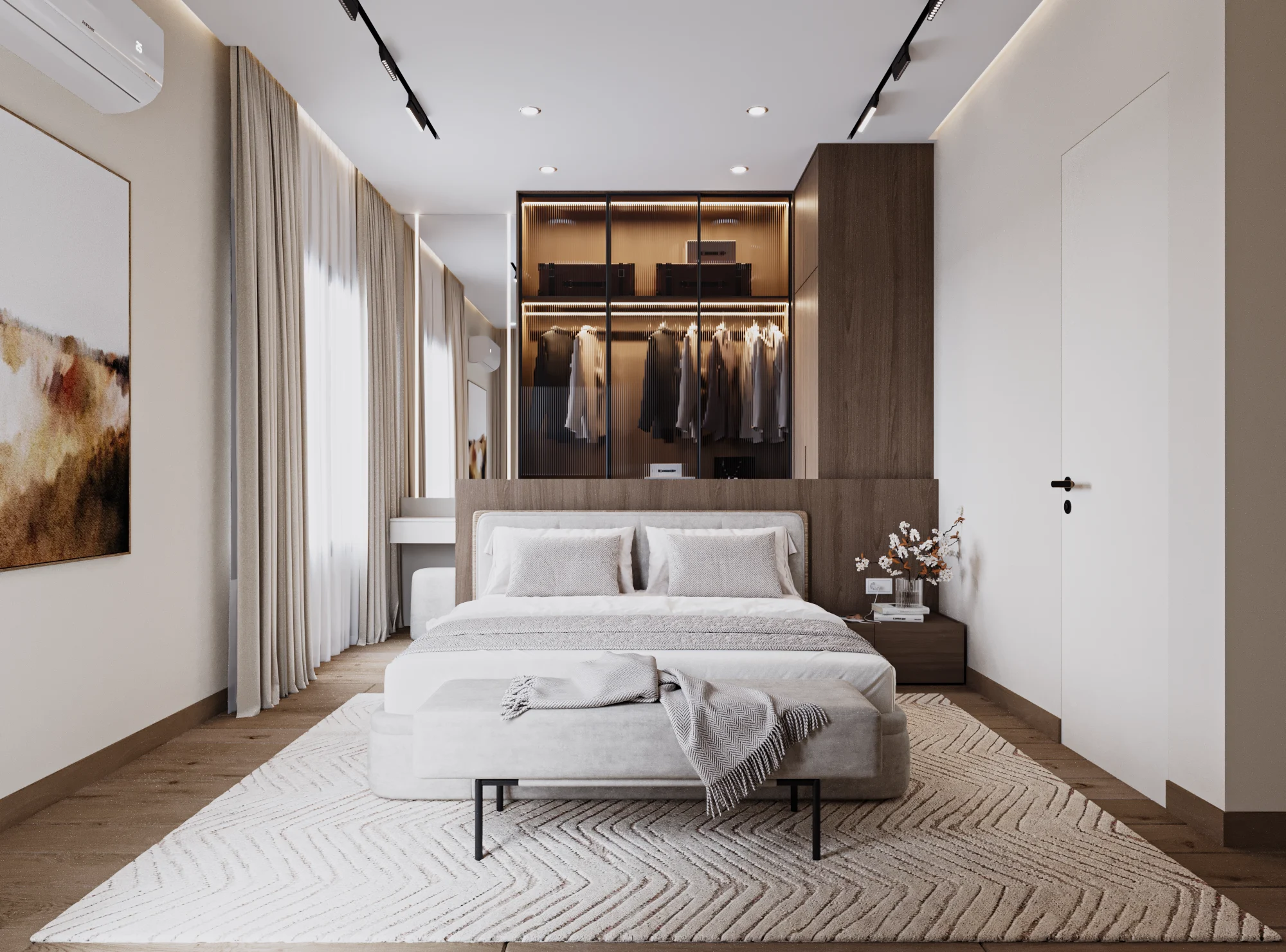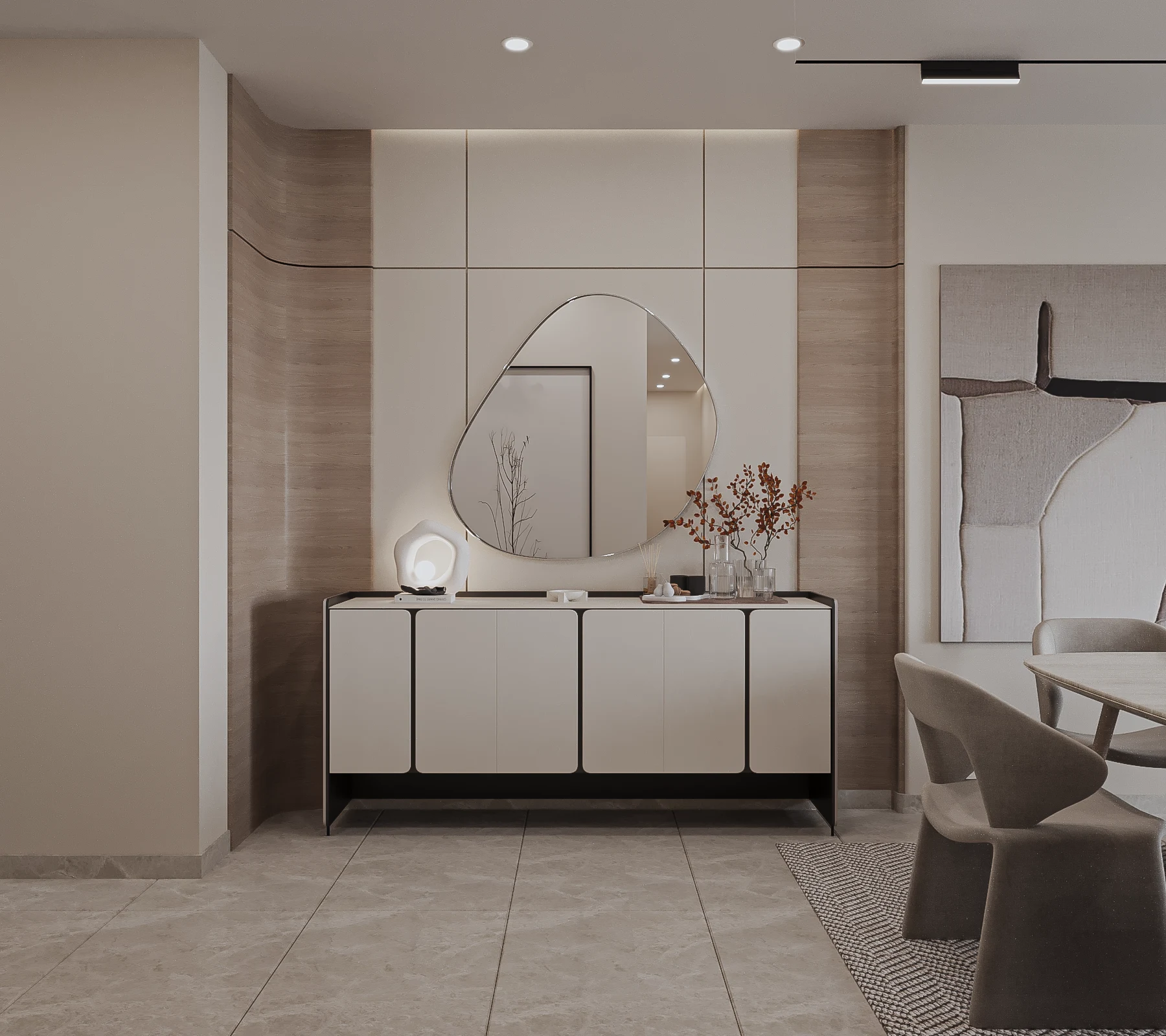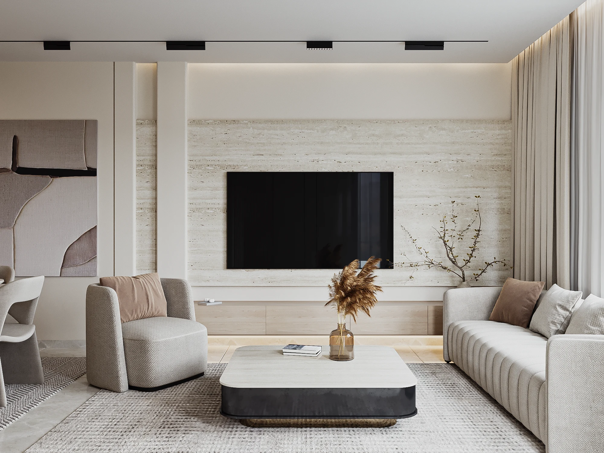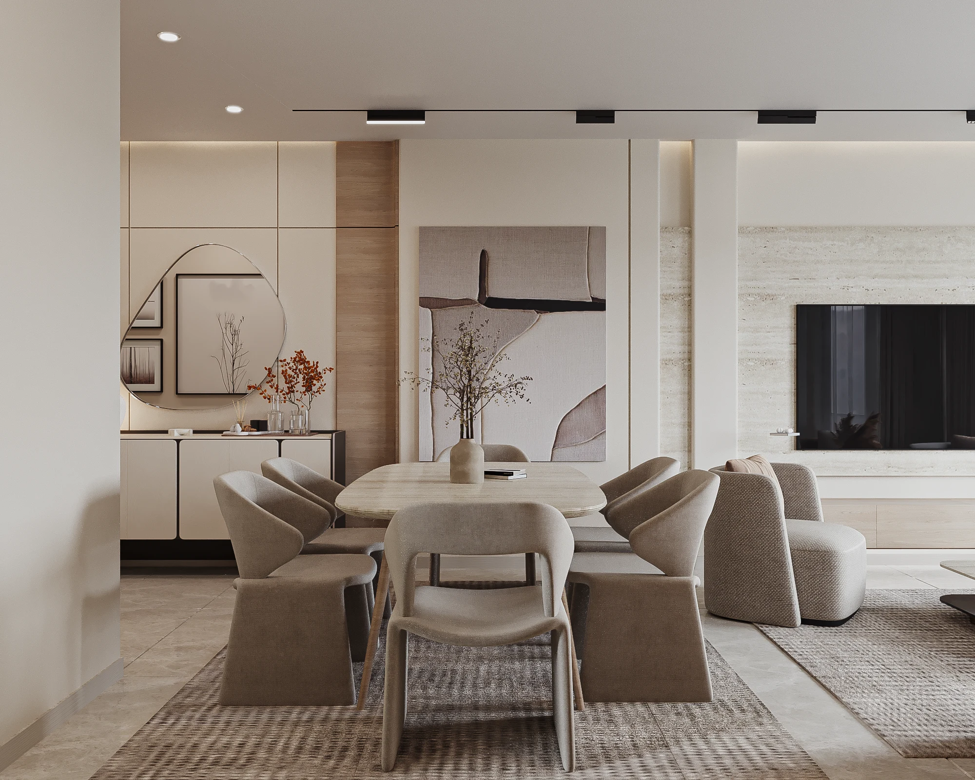 Capstone delivered a minimalist apartment, utilizing a sophisticated palette of soft greys, natural woods, and simple geometries. The design emphasizes open space and functionality, with integrated storage and clean-lined furniture, all as part of a turn-key project encompassing interior design, fit-out, and furnishing.