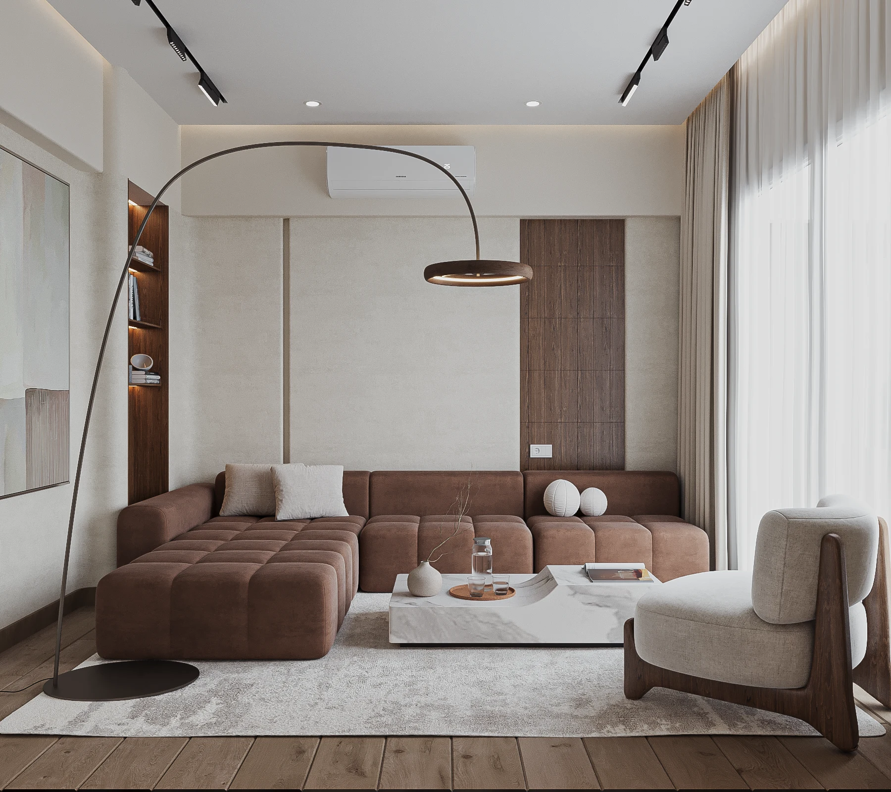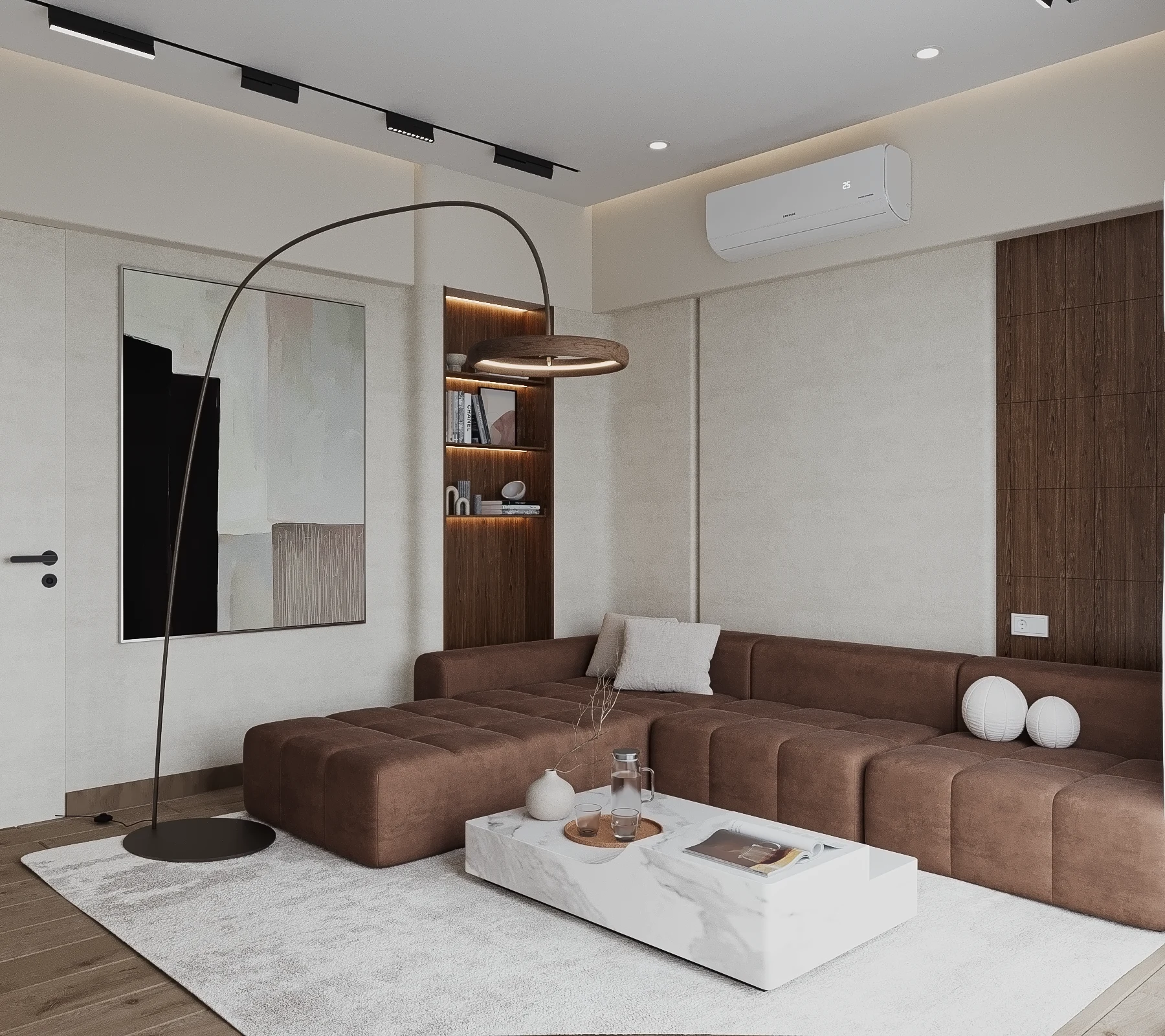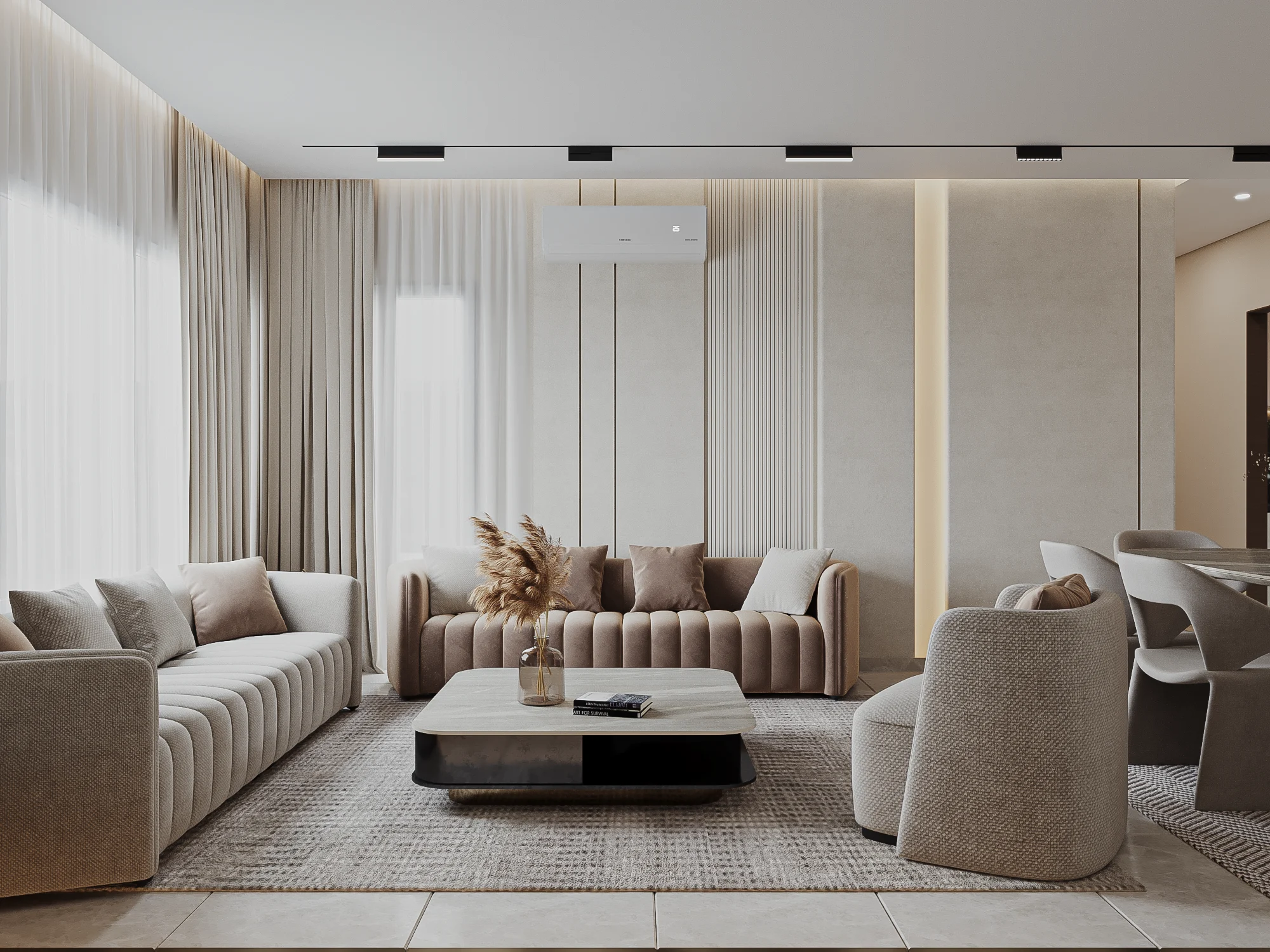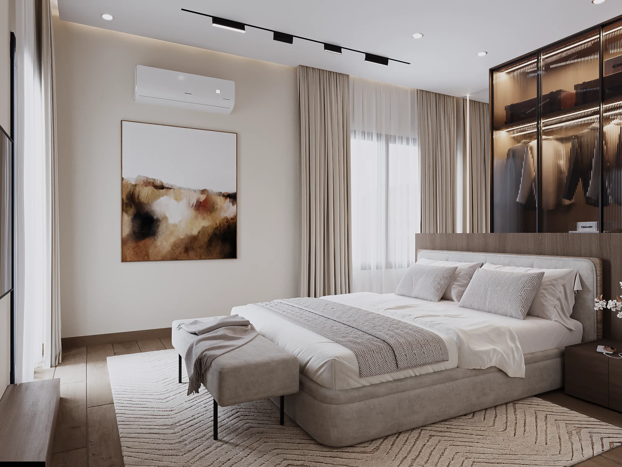 Capstone delivered a minimalist apartment, utilizing a sophisticated palette of soft greys, natural woods, and simple geometries. The design emphasizes open space and functionality, with integrated storage and clean-lined furniture, all as part of a turn-key project encompassing interior design, fit-out, and furnishing.